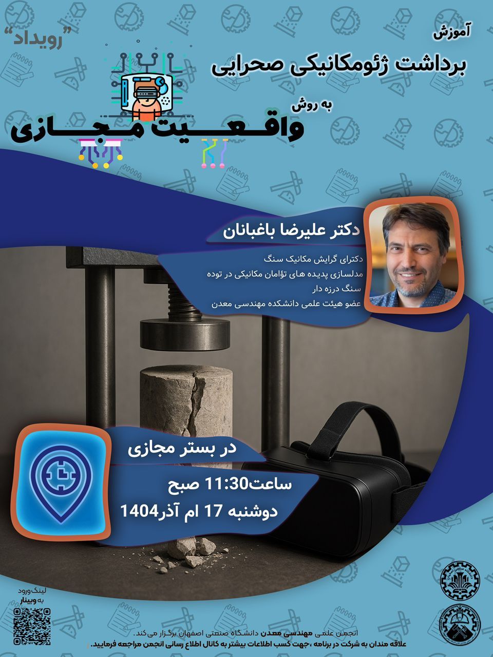 در این کارگاه، شرکتکنندگان با رویکردهای نوین در برداشت ژئومکانیکی، تحلیل رفتار سنگ در محیطهای میدانی، و کاربرد فناوری واقعیت مجازی در ارزیابی ویژگیهای مکانیکی تودهسنگ آشنا خواهند شد — رویکردی که میتواند در پروژههای معدنکاری، ژئوتکنیک، ارزیابی پایداری و تحلیل شکست سنگ بسیار مؤثر و تحولآفرین باشد.
